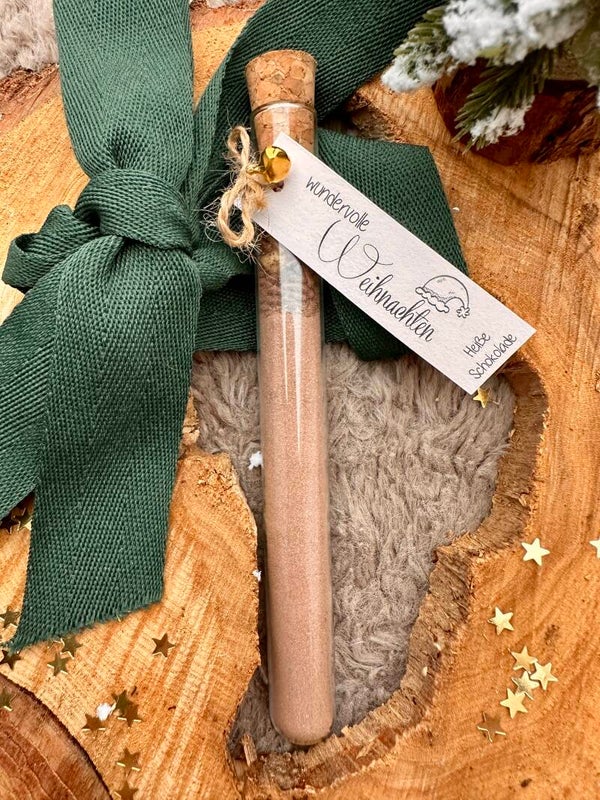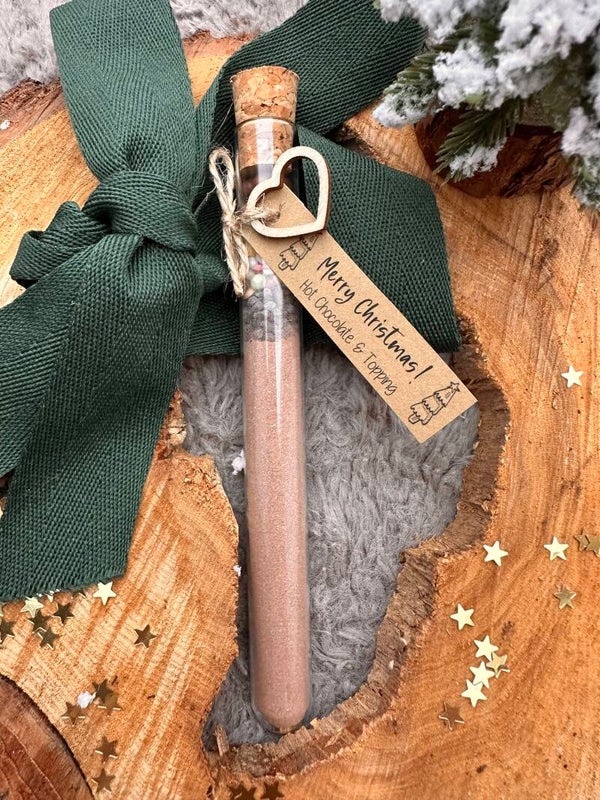 Ich fertige für Euch in liebevoller Handarbeit dekorierte und mit Kakao oder weißer Schokolade befüllte Reagenzgläser mit leckerem Topping, Anhänger und optional einem Dekoelement nach Wunsch.